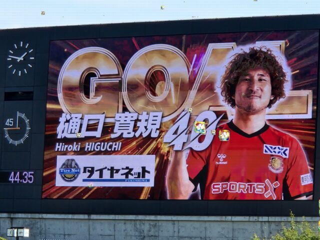 前半、ようやく樋口選手がゴール。よっ、カレー部長、モジャモジャ凄いぞ。(隣にいたサポーターが、モジャモジャ~と叫んでたので真似して言ってみた)確かに髪がバクハツしてる。
