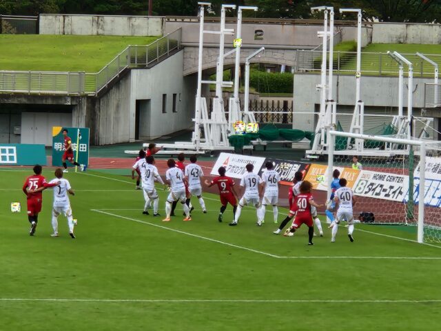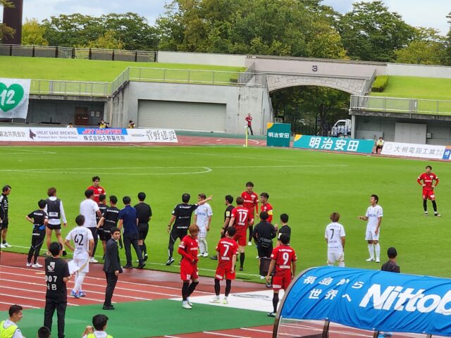 一発触発か?と思われる場面も。モジャモジャ(樋口選手)が突き飛ばされたので、サポーターからは「レッド、レッド」コール。サポーターも選手もヒートアップ。