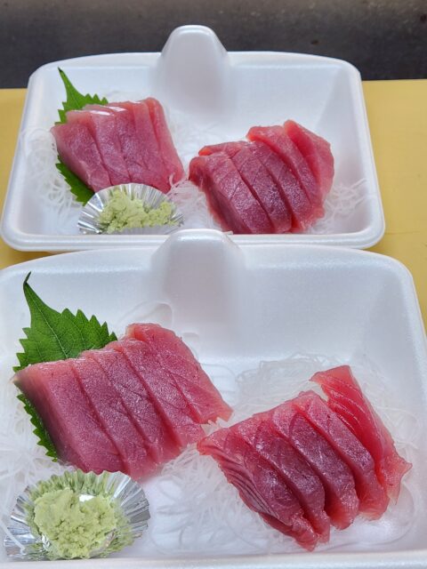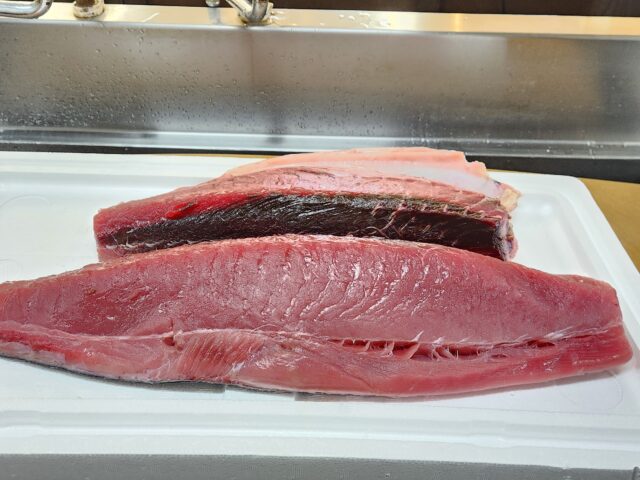 2025年10月10日 / 最終更新日時 : 2025年10月10日 阿部 お知らせ まぐろの日 今日、10月10日は、まぐろの日。奈良時代、万葉歌人の山部赤人が、まぐろを獲って栄えた明石を讃えた歌を詠んだことが始まり。ちょっとピンと来ないが。 オススメは宮城県のメバチマグロ。 いま、台風の影響で海が時化ており、全体的に魚の入荷が少なくなっています。 赤身ですが多少、脂あり。 20パック出来ます。 今日は他にも本マグロ、メジマグロ(本マグロの子ども)、まぐろぶつ、いろいろあります。 まぐろが当たる応募用紙もまだ余ってます。どうか皆さん、店頭で記入して応募して下さいね。