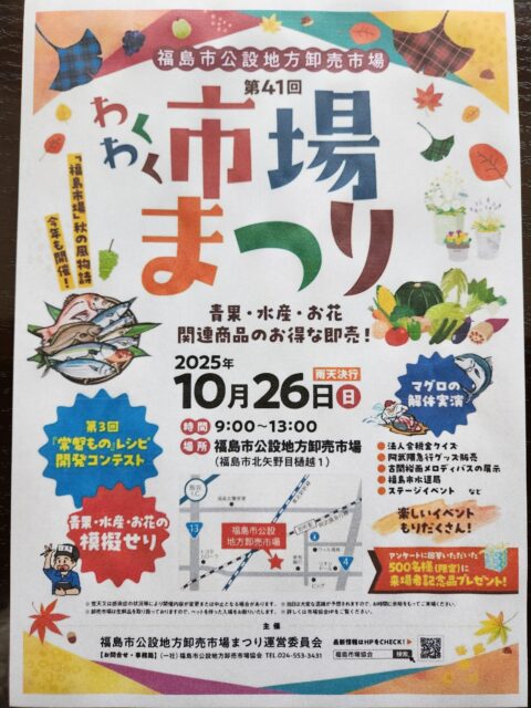 ➃わくわく市場まつり(26 福島市公設地方卸売市場)大好評、大人気の市場まつり。魚、野菜、果物、花が激安。普段入れない市場に入るチャンス。