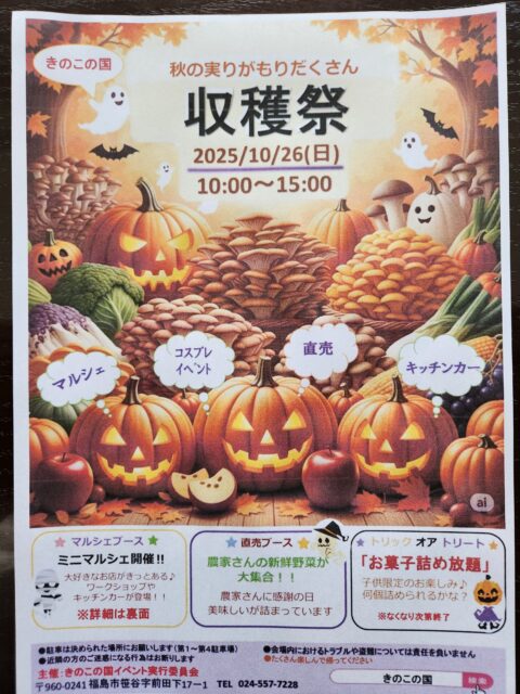 意外と穴場。野菜直売、お菓子詰め放題、キッチンカーも出ます。きのこだけじゃないよ。