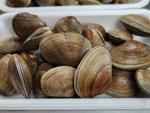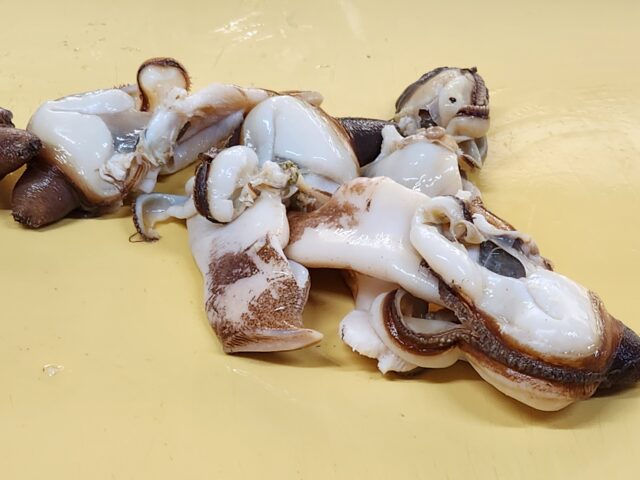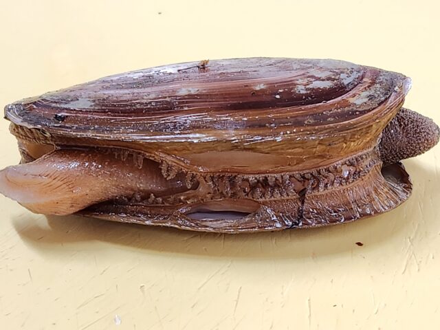 柔らかい殻を割るとこんな感じ。東北以北アラスカに生息する貝で、北海道より入荷。南国には居ない貝なんですね。