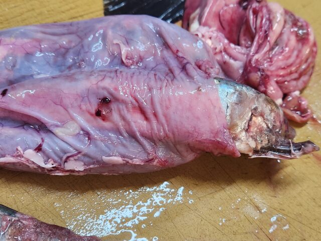 解体したら案の定、胃袋(青マーク)から出るわ出るわ、イワシが次々。