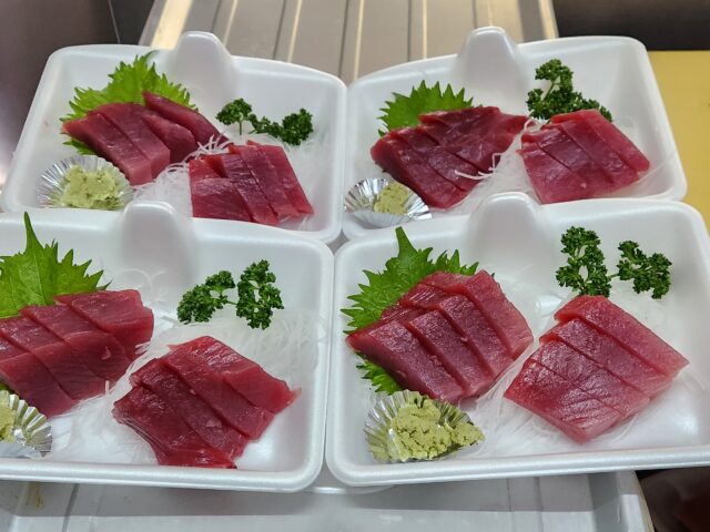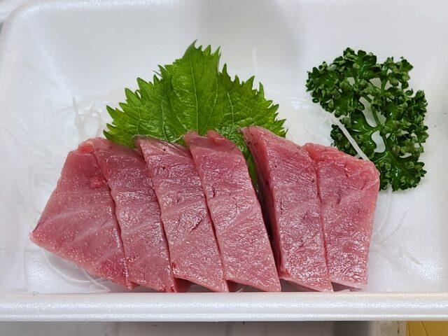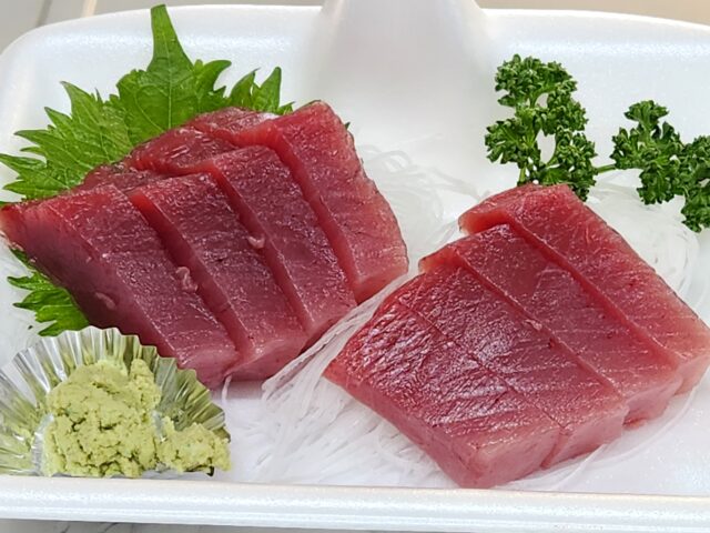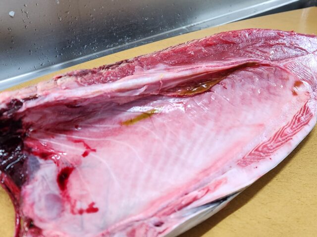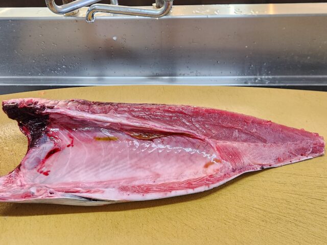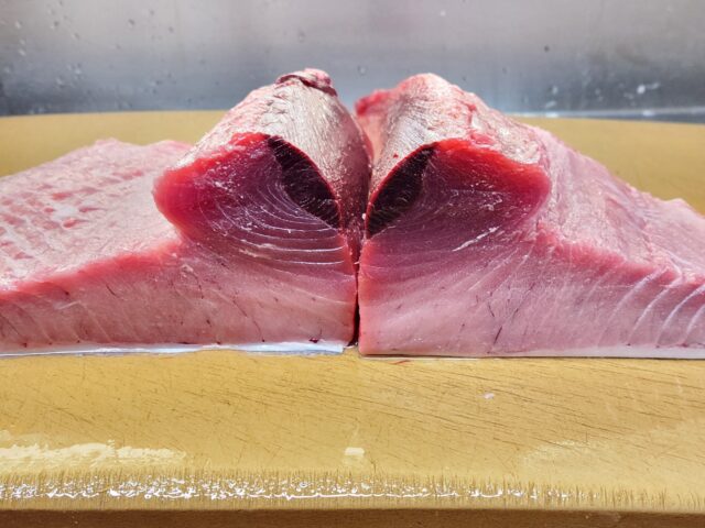 メジマグロはクロマグロの幼魚。30キロ未満、体長1メートル以下を指します。半分に割ると断面がキレイ。