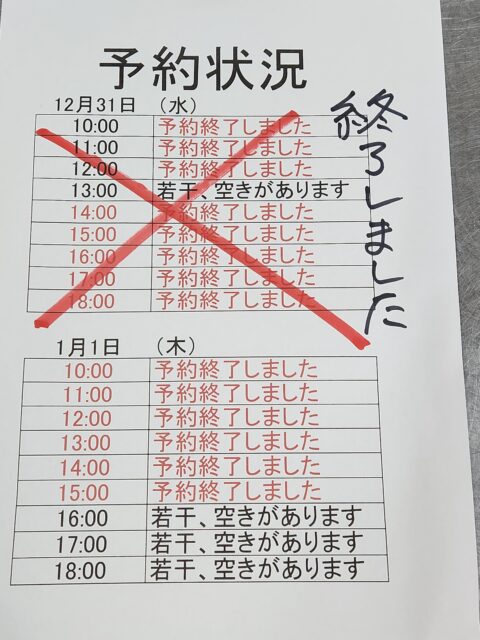 2025年12月26日 / 最終更新日時 : 2025年12月26日 阿部 お知らせ 年末年始の予約について 大晦日、12月31日(水)の予約は締め切らせていただきました。 元旦夕方、若干空きがあります。