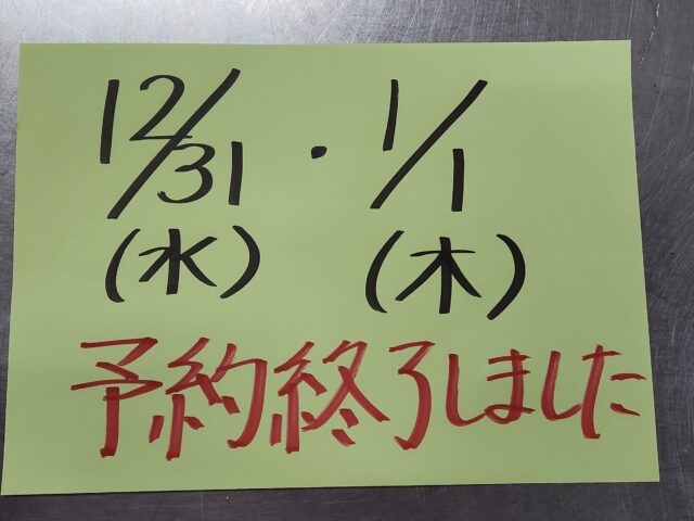 2025年12月29日 / 最終更新日時 : 2025年12月29日 阿部 お知らせ 年末年始の予約について 大晦日、元旦の予約は全て定数に達したため、終了しました。なお、大晦日は来店されても店頭に刺身はございません。 空きがあるのは下記の日時になります。 1月2日(金)午後5時〜 1月3日(土)午後1時〜 よろしくお願い致します。