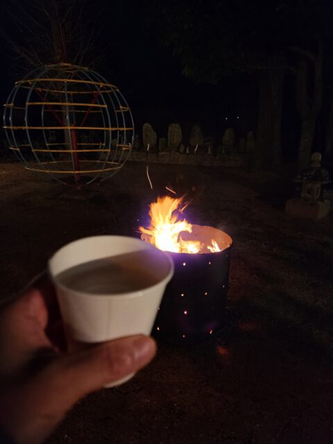 甘酒とみかん。冷えた身体はドラム缶の焚き火で、あったまる~。