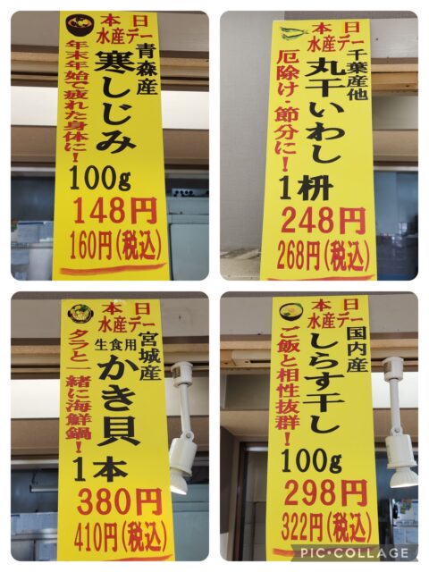 2026年1月20日 / 最終更新日時 : 2026年1月20日 阿部 セール・特売 水産デー 今日明日は水産デー。チラシ入らないので別名「誰も知らない水産デー」 「来なきゃ知らない水産デー」 「いつの間にかやってた水産デー」 「なんかお買い得あんの?水産デー」 ってとこですかね。 他にも塩たら、明太子、たらこ、生たらこあります。