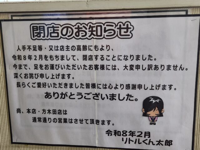 物心ついた頃からよく食べていただけに残念。また、ご近所さんの灯りが消えてしまう。本店、方木田店は継続らしいです。