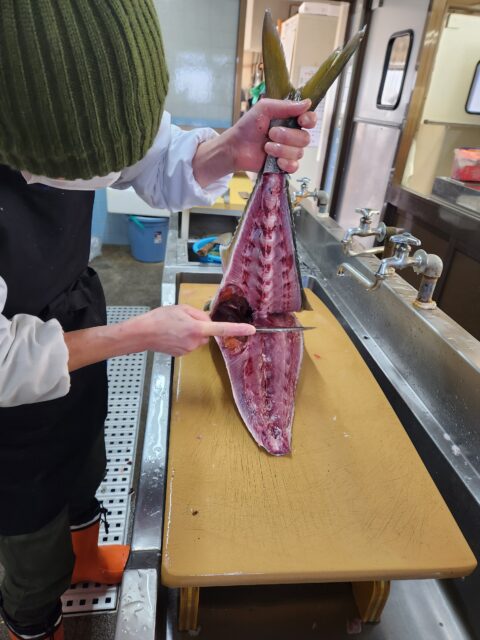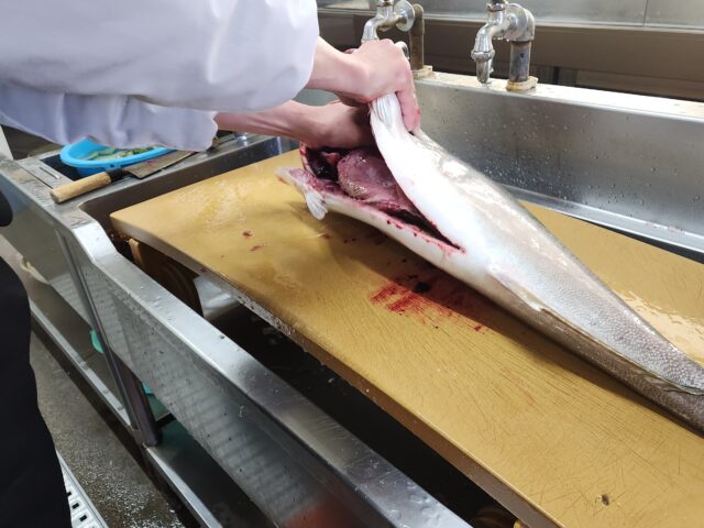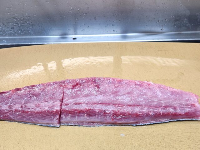 骨に沿って半分に切ります。