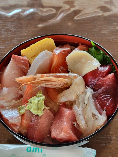暖かいのに風が強く、かなり寒く感じる日に。海鮮丼と熱々のタラ汁で、疲れを癒していただきました。