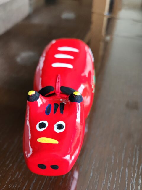 最初から体は赤色に塗られており、絵の具で10分ほど遊んで完成。美術センスがないのでマヌケ顔に。