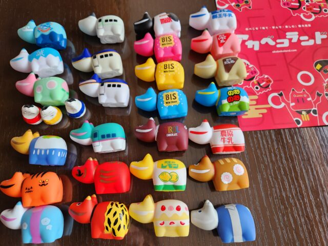 せっかくなので、可能な限りソフトビニールのミニあかべこを揃えてみました。新幹線やチロルチョコ、酪王バージョン。栃木のレモン牛乳なんかもありました。なんでだ?