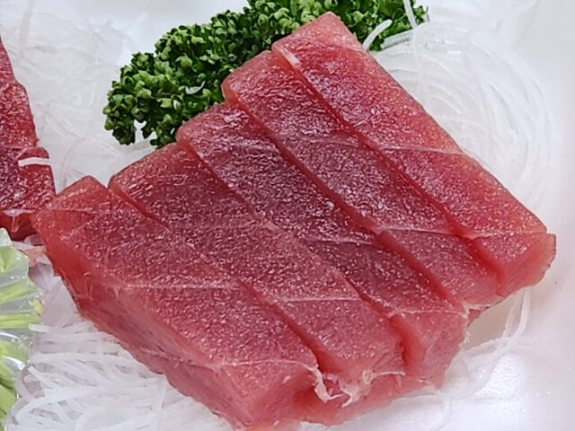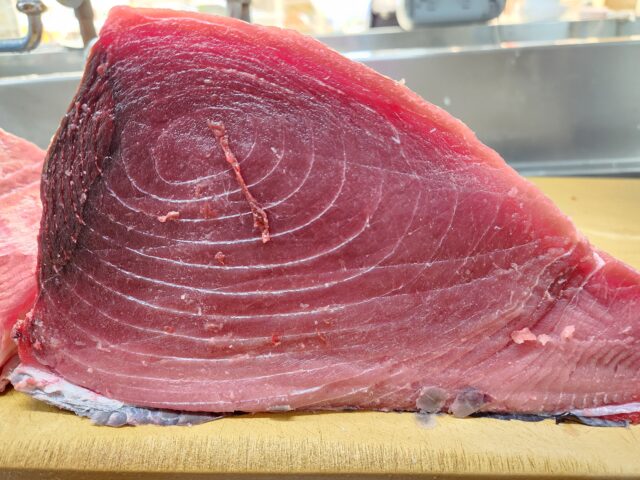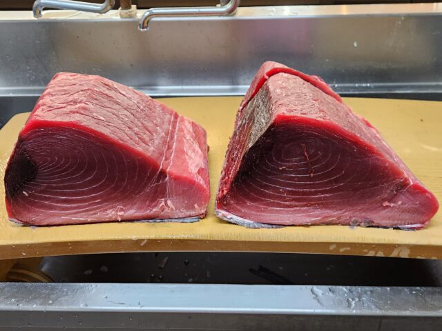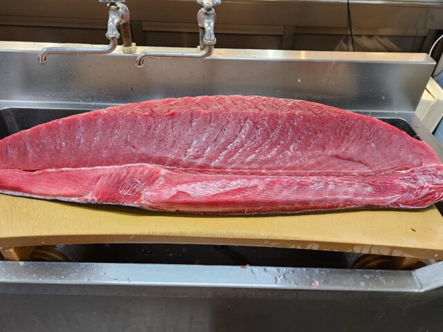 2026年4月8日 / 最終更新日時 : 2026年4月8日 阿部 お知らせ メバチマグロ 毎日突風吹き荒れ、まさに春の嵐ですね。天皇陛下も無事に帰京されたようで良かったです。 本日オススメは千葉県のメバチマグロ、約18キロ。以前掲載した2月も突風だったので、強風の日はメバチマグロなのか? すでに市場で解体済みなので写真は、ここからスタート。 総重量100キロ越えと推定。 天然のため、全体的に黒っぽく見えますが全部赤身。 見ての通り沢山出来ます。 お好きな量を切り分けることも可能です。 今日はマグロを堪能して下さい。