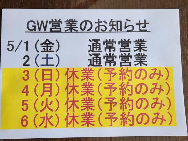 遅くなりましたが、GWの営業についてお知らせします。
